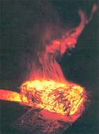 Déjà, à ce niveau se dégage l'excellence du matériau. Les morceaux de métal ainsi produits sont cassés en petits bouts de 3 a 5 cm. Le forgeron les triera suivant la teneur en carbone, et donc la dureté qu'il estime en chaque morceau.
