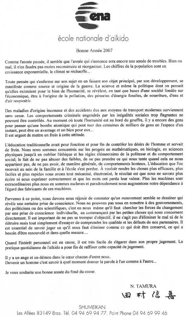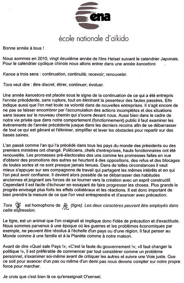 En Aïkido, l'esprit anime le corps mais par le mouvement du corps nous entraînons l'esprit. De tels Budo sont d'une importance fondamentale. Que diriez-vous d'unir vos coeurs et vos esprits pour un développement mutuel afin d'essayer de vivre dans la plénitude, la joie, le bonheur. Cette joie peut être partagée non seulement avec nos frères humains mais avec tous les êtres vivants. Entamons le siècle qui vient dans cet esprit de vie juste, de partage et de progrès. Je vous souhaite à tous une bonne année 2004.